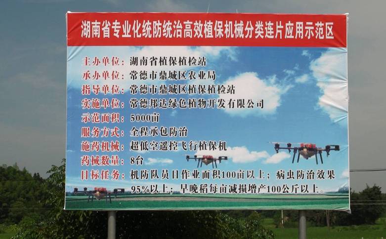 此次示范由常德邦达绿色植物开发有限公司实施,示范面积5000亩,示范机械为超低空遥控飞行植保机。通过示范客观评价超低空遥控飞行植保机在一定规模面积上的效率、效能、效果、效益。