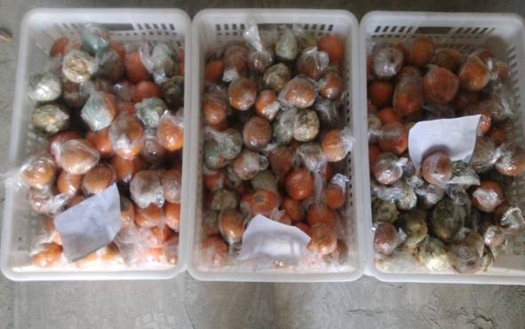 去年12月至今年4月,芷江县植保站与江苏龙灯化学有限公司合作在麻缨塘乡麻缨塘村园艺场开展柑桔储藏期病害药效试验。试验设6个处理,即42%双胍·咪鲜胺锰盐250倍、500倍、750倍液、45%马克西姆扑霉灵1000倍、45%咪鲜胺1000倍和清水对照。植保技术人员严格按照试验方案要求,于2014年12月5日对供试果进行药剂处理,在药剂处理后15、30、60、90天分别记载各类柑桔贮藏病害的烂果情况,并计算了烂果率及贮藏防病效果。