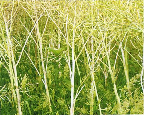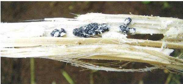 油菜菌核病俗称白秆、空秆、烂秆、霉蔸等,是我省油菜最主要的真菌性病害,常年均有不同程度的发生,一般年份减产1~2成,严重发生年份减产3~5成,甚至绝收。油菜全株叶片、叶柄、茎秆、分枝、花、角果等部位都可发病,以主茎发病损失最大(见图1)。每年的3月上旬底(少数年份冬前亦可见病斑),病斑首先出现在下部叶片上。叶片病斑呈圆形或不规则形,黄褐色或灰白色,典型病斑可见数层同心轮纹,病斑背面铁青色,田间湿度大时可见白色絮状物(见图2)。茎秆和分枝病斑为梭形或长条形(见图3),淡褐色水渍状,后渐为灰白色,湿度大时病部软腐,表面着生白色絮状霉层,内部空心,后期可见鼠粪状菌核(见图4),干燥后皮破裂,纤维外露像麻绳丝。花瓣感病,可见油渍状褐色小点,发病角果与茎、枝病斑相似,病部灰白,表皮粗糙,有的病角外被白色菌丝包住,形成小菌核。