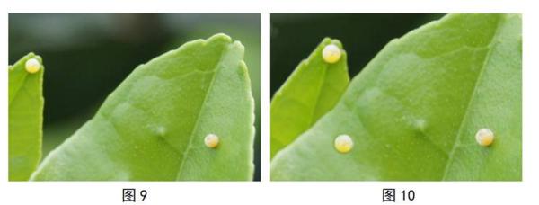 3.4 移花接木技术。这实际上是“造假”技术,但有时又必须进行适当“造假”,我们才能得到一张很好看的像片。例如,抓拍中,常常拍了好多张像片,也没有一张很满意的像片。但会发现有时将其中基本是同时拍的两张像片合成一张像片时,就会得到一张很满意的像片。例如,抓拍人物活动时,得到一张很好看的像片时却发现其中一人的眼睛是闭着的,使得像片无法使用,而基本是同时另拍的并不好看的像片中,这个人的眼睛是开着的。这时我们就可以使用移花接木技术将此人开着的眼睛合成到那张闭着眼睛的像片中去而得到一张完美的像片。下面给出一张植保工作中经移花接木技术处理的像片的效果图。图9中两粒卵,相距较远,视觉上不怎么好看。这时我们可以将左边的那粒卵复制到有另一粒卵的叶片上来,或者将左边的叶片整叶移动一下位置,整体就好看多了,得到图10。