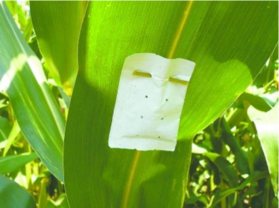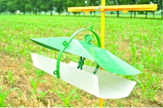 利用释放人工合成的昆虫(雌)性激素(雌信息素),诱杀雄性玉米螟成虫,阻止其交配、产卵,达到控制玉米螟数量的目的。防治时每亩放2-3套性诱捕器,放置高度为玉米植株20厘米以上。每4-6周需要更换一次诱芯。