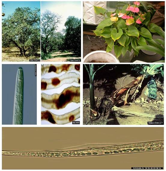 象,在土壤缺水和干旱季节易迅速萎蔫,在发病柑橘园中,果树衰退以每年约15米的速度扩散,故柑橘穿孔线虫病又称为柑橘扩散性衰退病。胡椒被侵染后,细嫩的营养根表现出明显的橙色到紫色斑痕,老根上的斑痕呈棕色、不明显,根系大量腐烂,细嫩的营养根比主根腐烂快,随后较大的侧根大量坏死;地上部表现为叶片变黄、下垂,随后落叶、落花、生长停止,最后死亡。观赏植物及其他寄主植物被害,一般表现为根部出现大量空腔,韧皮部和形成层可完全毁坏,出现充满线虫的间隙,使中柱的其余部分与皮层分开,根部坏死斑呈橙色、紫色或褐色,根部坏死处外部形成裂缝,根腐烂,地上部一般表现为叶片和花缩小、无光泽或变色,新枝生长弱,严重受害植株整株黄化、萎蔫枯死。