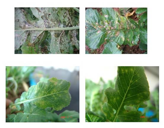 【症状特点】 植株叶、茎、花梗、角果和根头部均可受害。病斑初起出现在叶片背面,初生不规则开、水浸状或油浸状绿色至淡褐色小斑点,直径很小,后变为具有光泽的褐色或黑褐色不规则形或多边形病斑,薄纸状,不突破叶脉;开始时在外叶发生多,后延及内叶,叶片正面初起为与叶背对应的青色斑块,当坏死斑融合后形成大的不整齐的坏死斑,可达2~4cm以上,后变为淡褐,黑褐色焦枯状;病菌还危害叶脉,致使叶片生长变缓,叶面皱缩,开始外叶发生多,后波及内叶;发病严重时,全株叶片表现为白色灼状斑块,后变为淡褐色焦枯状,导致植株枯黄而死亡。茎及花梗上病斑椭圆形至线形,水渍状,褐色或黑褐色,有光泽,斑点部分凹陷。角果上产生圆形或不规则形黑褐色斑,偶成条斑,稍凹陷。根头部初生暗色病斑后变深,渐成黑色,或不规则圆形斑纹。