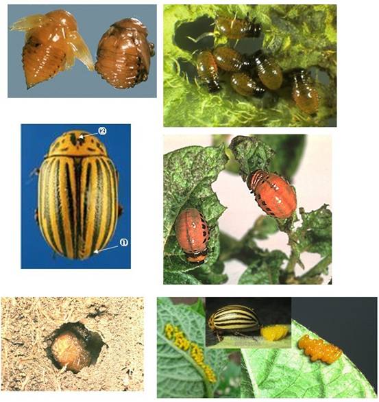 【发生特点】 美国2代/年,欧洲1-3代,以成虫在土深7.6—12.7cm处越冬,翌春土温15℃时,成虫出土活动,发育适温25—33℃。我国马铃薯甲虫以成虫在寄主作物田越冬,一年可发生1~3代。在新疆伊犁河谷昭苏等地一年发生1代;在霍城和察布查尔等地一年发生2~3代,其中以2代为主。越冬成虫需要补充营养。卵块产在叶背,每卵块有20一60粒卵,产卵期2个月,1头雌虫在田间平均产卵400~700粒。最多达2500粒,在实验室可产4000粒,卵期5—7天。幼虫共4龄。初孵幼虫取食叶片,幼虫期约15—35天,4龄幼虫食量占77%,老熟后入土化蛹,蛹期7—10天,羽化后出土继续为害,多雨年份发生轻。该虫适应能力强。