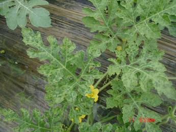 【寄主范围及典型症状】 寄主主要为葫芦科作物,包括黄瓜(Cucumis sativus)、葫芦(Lagenaria siceraria)、甜瓜(Cucumis melo L.)、丝瓜(Luffa cylindrica)、苦瓜(Momordica charantia)、西瓜(Citrullus lanatus);此外还有藜科植物(Chenopodium amaranticolor)、杏树等。