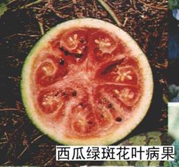 CGMMV侵染植物产生的症状因寄主、环境条件及株系的不同而有差异,一般会使葫芦科作物的植株生长缓慢、矮化,结果延迟,严重的导致不孕;叶片出现色斑、水疱及变形;果实外部通常没有症状或出现色斑,内部果肉往往出现变色、纤维化及腐烂;有的病株不出现症状而表现为无症侵染。