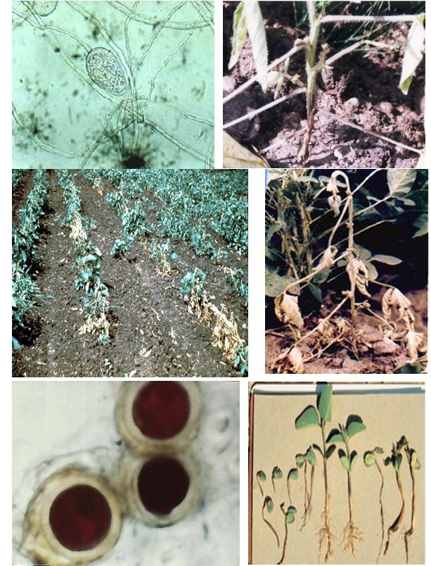 【症状特点】 可以在大豆的各个生育期危害。在大豆出苗前可以引起种子腐烂、出苗前腐烂,出苗后可以引起植株枯萎。一般苗期感病植株表现为出苗差、近地表茎部出现水浸状病斑、叶片变黄萎蔫,严重进植猝倒死亡。成株期植株受侵染后下部叶片变黄,随后上部叶片逐渐变黄并很快萎蔫;近地表茎部病斑褐色,并可向上扩展,茎皮层及髓变褐;根腐烂,根系发育不良;未死亡病株的结荚数明显减少,空荚、瘪荚较多,籽粒皱缩。由于在潮湿条件下,根部侵染的病菌可以产生大量游动孢子,孢子随雨水飞溅,危害茎部和叶片,甚至出现病荚,其症状为绿色豆荚基部出现水浸状斑,病斑逐渐变褐并从荚柄蔓延至荚尖,最后整个豆荚呈黄褐色干枯,种子失水干瘪。