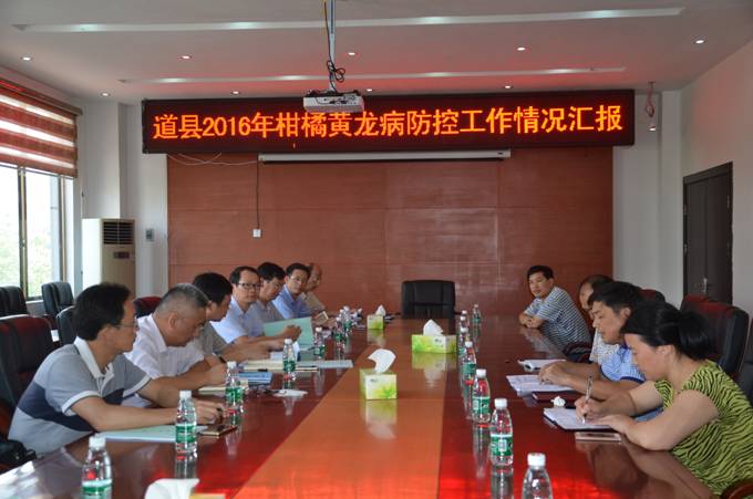 在道县农业委小会议室,县政府周龙平副县长、县农委邹现成副主任、县植保植检站何斌站长分别作了柑橘黄龙病防控工作汇报。督查组认真核查柑橘黄龙病防控补助试点项目资金使用情况资料,对道县在柑橘黄龙病防控工作方面所取得的成绩给予了充分肯定。指出:一要抓好木虱防治。开展木虱统防统治,高质量完成中央财政补助的防治任务。二要开展疫情普查。要抓住果实成熟显症时期,鉴别病株,摸清病树底数。三要抓好病树清除。结合冬季清园,及时清除病株。四要抓好技术培训。抓住果实成熟显症时期,开设田间课堂。五要做好项目总结。要做好项目实施效果评估、项目总结、成果宣传等工作。(冯清)