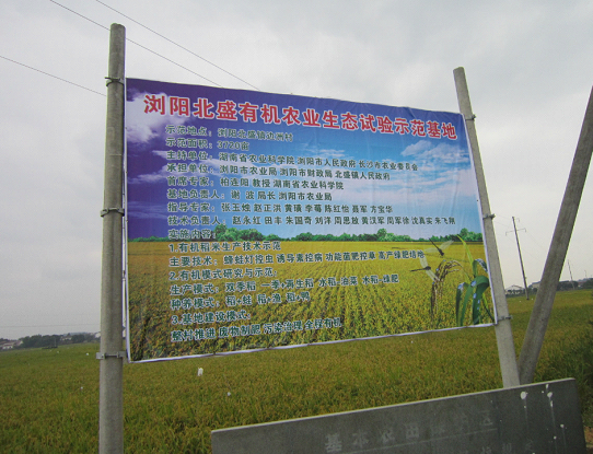 浏阳北盛有机农业生态试验示范基地面积3720亩,基地采用整村推进、废物制肥、污染治理、全程有机的建设模式,打造“种养结合”、“生态循环”、“绿色发展”理念,主要采用蜂蛙灯控虫、诱导素控病、功能菌肥控草、高产绿肥培地等示范技术;生产模式与种养模式多样化,如:双季稻、一季稻、再生稻、水稻与油菜及绿肥轮作等生产模式,稻与蛙、鱼、鸭等共生的综合种养模式。