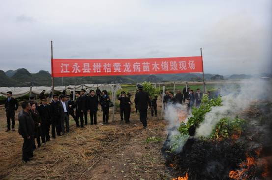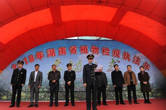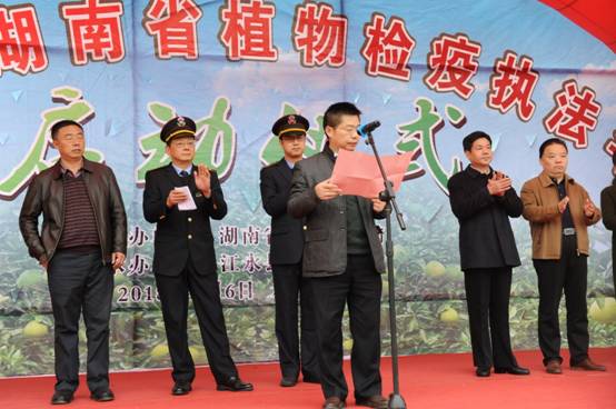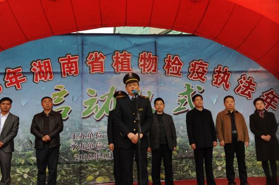 3月6日,湖南省2018年农业植物检疫执法年启动仪式在永州市江永县举行。全国农技中心检疫处冯晓东处长、省植保植检站杨孚初站长、江永县唐德荣县长、何福明副县长、省农委经作处杨为青副处长、法规处姚金华调研员、种子站汤传喜副调研员、永州农委张卫阳副主任、郴州市农委李熙平调研员、湖南农大和湖南省农科院有关专家等出席启动仪式。全省14个市州植保植检站站长、永州市各县市区农委分管负责人和部分植物检疫员、宜章县等8个柑橘黄龙病发生区和高风险区县市区的植保植检站站长参加了启动仪式。启动仪式由省植保植检站谭小平副站长主持。