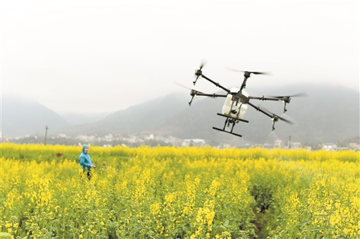 2月28日,双峰县锁石镇车田村,技术人员操作植保无人机在喷洒农药和硼肥。为做好油菜病虫害的防治工作,连日来,该县农业技术推广中心组织技术人员,调集8架植保无人机来到锁石镇油菜花基地开展高效作业。李建新 周俊刚 摄影报道