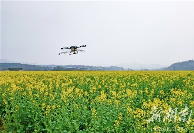 当天,在靖州县新厂镇四乡龙农机服务专业合作社,一片金黄的油菜田上空,飞防工作人员操作熟练、现场配药、飞机起飞、喷施药液等程序有套不紊地进行,植保无人机在专业人员的遥控下,从油菜上方轻轻掠过,机翼两侧的喷杆下均匀地向下喷洒着白色药物,200余亩油菜病虫害防治作业不到一个小时就完成了。