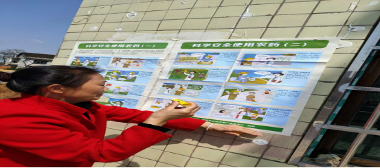 ▲双峰县植保人员在张贴科学安全使用农药挂图