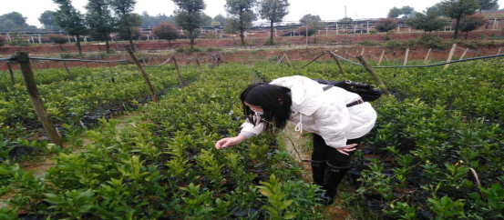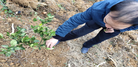 ▲图为娄星区植保人员在柑橘种植基地排查检疫性病害
