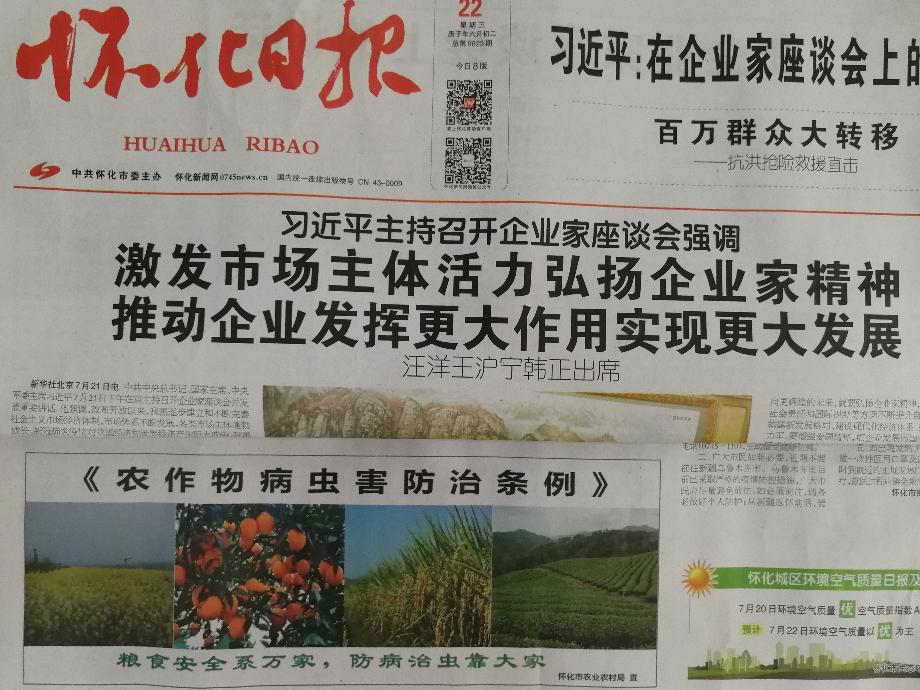 为进一步推进《农作物病虫害防治条例》宣传月活动的深入开展,扩大《农作物病虫害防治条例》的社会影响力,增加全市各界对《农作物病虫害防治条例》的认知度,7月21日,怀化市农业农村局在怀化日报刊载了《农作物病虫害防治条例》公益广告。
