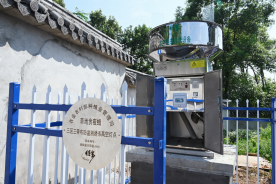 与会代表现场观摩了杨林街镇尚书村草地贪夜蛾“三区三带”布防监控点,了解了高空灯监测运行、日常管理、维护监管等相关情况。岳阳县作为全国“三区三带”监测防控项目任务县,在西起洞庭湖沿岸、东至大云山沿线每隔3~4公里布置1台高空监测防控灯,共布置14盏高空灯带及10000套性诱捕器,建起了一道坚实的防控阻截带。据统计,7月份每盏高空灯平均诱杀草地贪夜蛾成虫102头,其中雌蛾58头,在压低种群基数上有非常明显的成效。
