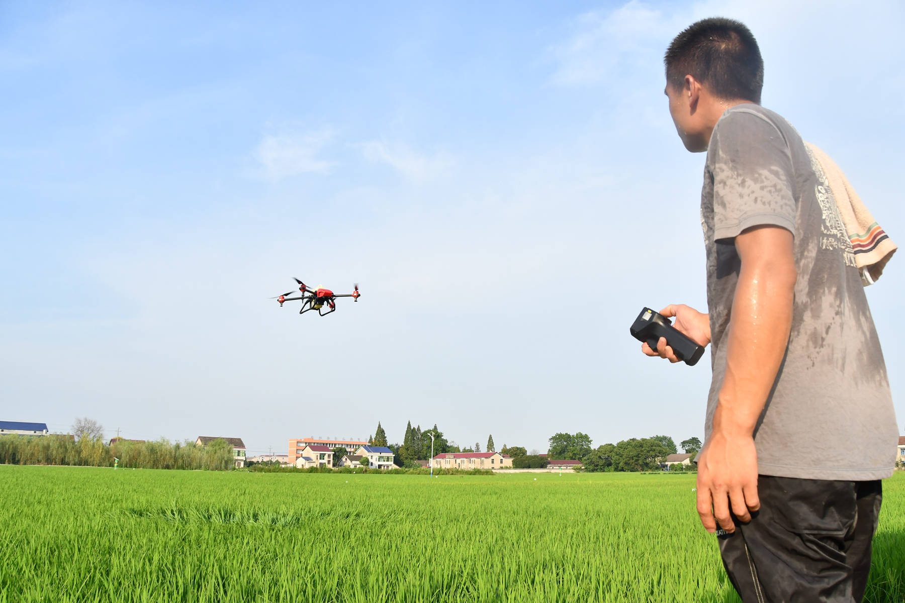 9月1日,在益阳市资阳区新桥河镇田庄湾村,合作社机手操作植保飞机实施灭虫作业。
