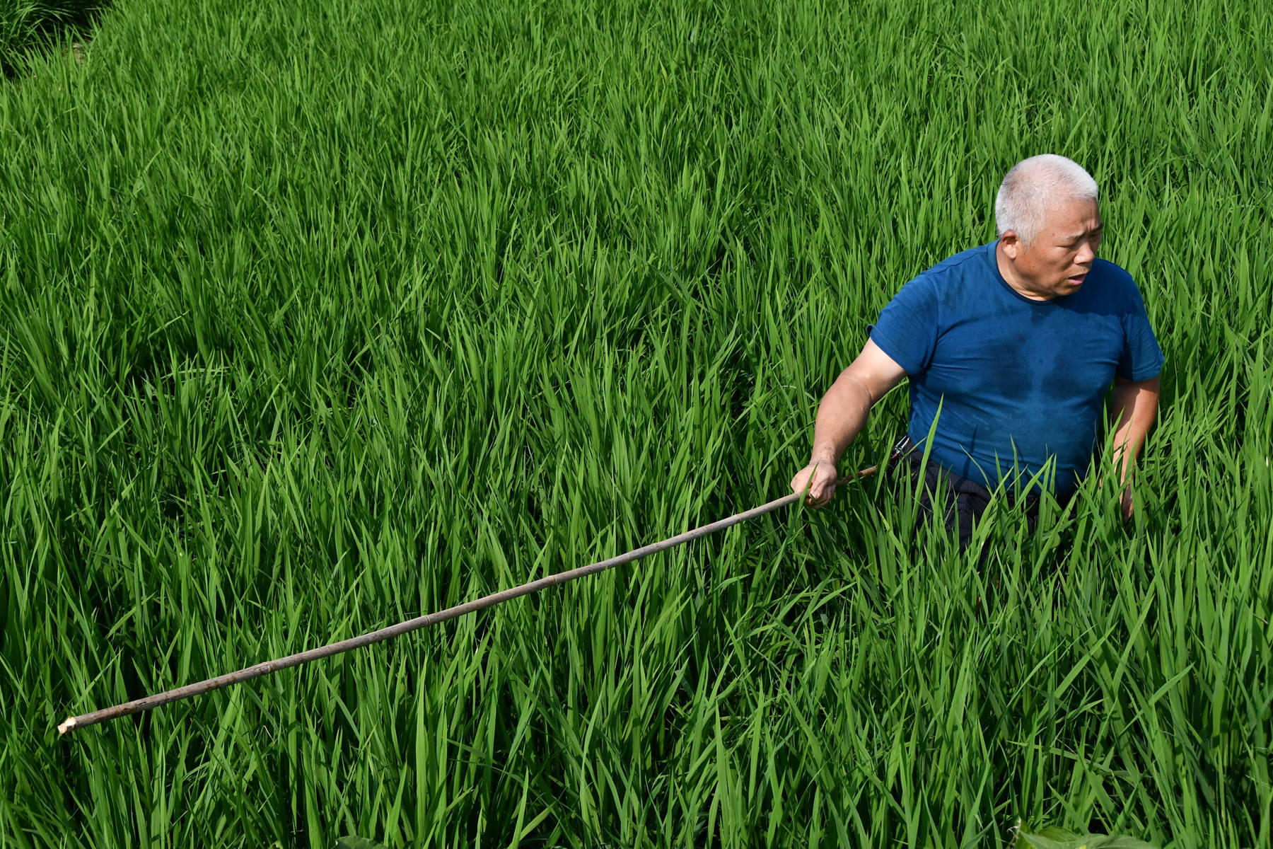 9月1日,益阳市资阳区农业农村局植保站站长张益夫在新桥河镇田庄湾村的监测田观察虫情。