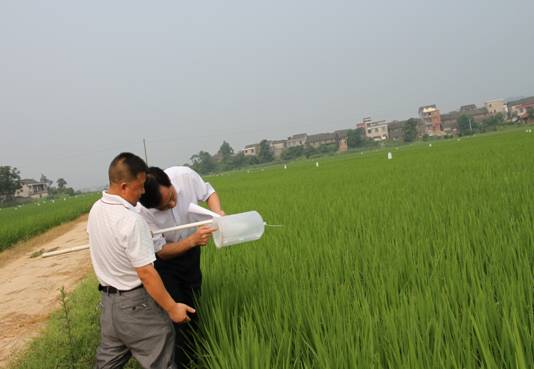 溆浦县农业局局长张克松(右)在检查稻纵卷叶螟诱捕器诱杀效果