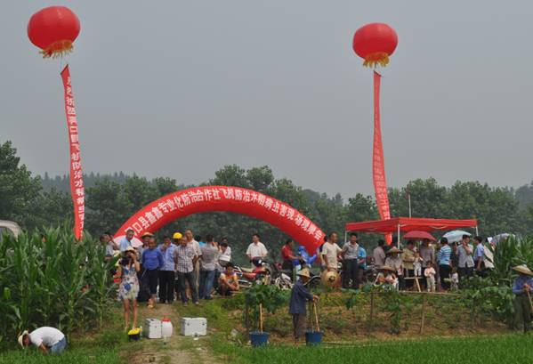 6月13日,洞口县农业局组织全县农作物病虫害统防统治专业合作社负责人、种粮大户、杂交制种基地负责人、各乡镇农技站站长、局全体干部职工观看了由洞口县鑫鑫农作物病虫害统防统治专业合作社承办的小型遥控飞机、背负式机动机防治水稻病虫害的现场演示会。县大人副主任罗崇雄、县政协副主席胡俊敏、副县级干部刘贵响、县农业局局长尹显光等领导到现场观看。周边村民都闻讯赶来观看。在遥控操作员的操作下,小型飞机升空作业,在田间上空飞行自如,不到2分钟就完成了一亩水稻的喷药防治任务,观看人员不禁呐喊叫好。