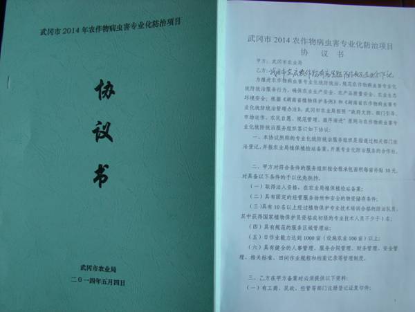 武冈市农业局根据《湖南省农作物病虫害专业化防治管理办法》制定了专业化防治项目协议书,协议明确了农业局及专业化防治服务组织的权利与义务,对服务组织实行“承包面积”、“防治作业要求”双百分量化考核,项目补贴以考核成绩多少进行补贴。5月6日,农业局召开全市18家专防组织负责人会议,并与服务组织签订协议。专业化防治协议的签订有利于服务组织的管理,有利于专业化防治工作健康、稳定、可持续发展。