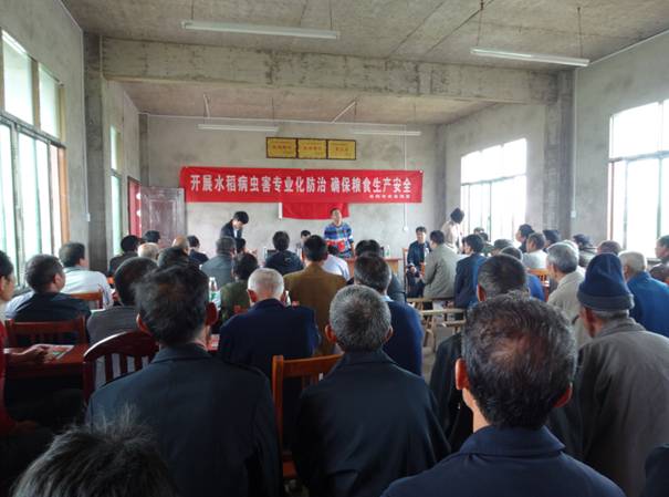 4月12日,永济镇大河边周边四个村在大河边村召开群众路线教育实践活动,耒阳市农业局紧抓这个机会对专业化统防统治工作进行了宣传发动。会上衡阳市植保植检站站长黄珍龙作了动员讲话,耒阳市农业局副局长王秋芽主讲了专业化统防统治工作的发展形势与好处,耒阳市植保植检站工作人员在会场发放了技术资料和病虫防治信息,会后举办了植保无人机施药作业演示观摩会。参加活动的人员有永济镇主管农业的副镇长、全体村干部、党员、种粮大户,部份专业化统防统治组织负责人等,共计90余人。此次宣传专业化统防统治工作,丰富了基层党组织群众路线教育实践活动内容,而且使专业化统防统治工作深入人心,极大地激发了种田大户参与专业化统防统治服务的兴趣与热情。