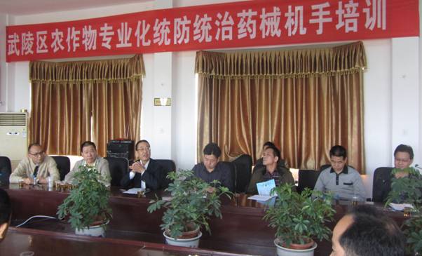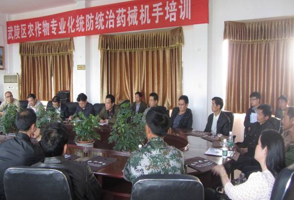 农林局局长陈国群、副局长唐则尧、副局长彭定宇,植保站全体工作人员,该区农作物专业化统防统治合作公司--湖南金大地公司、常德邦达公司主要负责人,河洑、丹洲等乡镇的农业干部、村组干部、种粮大户和农民代表,共40余人参加了本次会议。