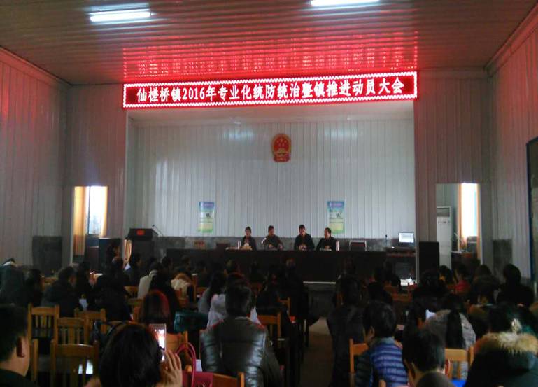为做好2016年水稻病虫害专业化统防统治工作,促进粮食生产健康发展、确保粮食质量安全、提高农民种粮效益,邵东县仙槎桥镇政府于2015年12月26日召开了由村(居委会)干部、全体镇干部共300多人参加的“仙槎桥镇2016年专业化统防统治整镇推进动员大会”。会议由镇长主持,农业镇长和农业站长就2016年专业化统防统治整镇推进的宣传发动、分片落实等提出了明确的目标和要求。邵东县炯祥植保专业合作社负责人介绍了专业化统防统治的运作方法。