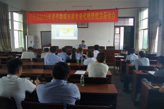 9月24日,怀化市植保站在洪江市安江镇组织召开全市2015年农作物病虫害专业化统防统治座谈会。各县市区植保植检站站长、湖南大方植保植保有限公司、怀新科农作物防控有限公司及洪江市9家专防组织负责人参加会议,张龙杰副站长主持会议。