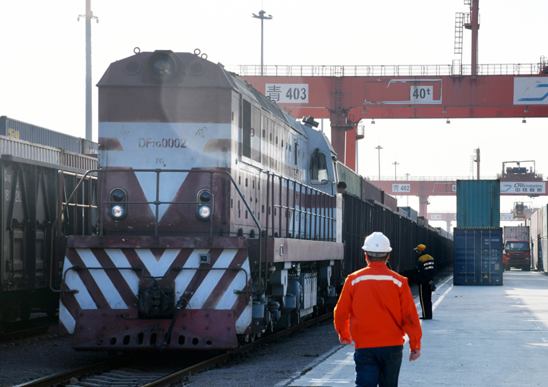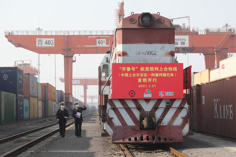一列搭载轮胎、汽车配件、电子元件等货物的“齐鲁号”中亚班列即将发车驶出位于青岛的中国-上合组织地方经贸合作示范区青岛多式联运中心(2020年11月9日摄)。新华社记者 李紫恒 摄