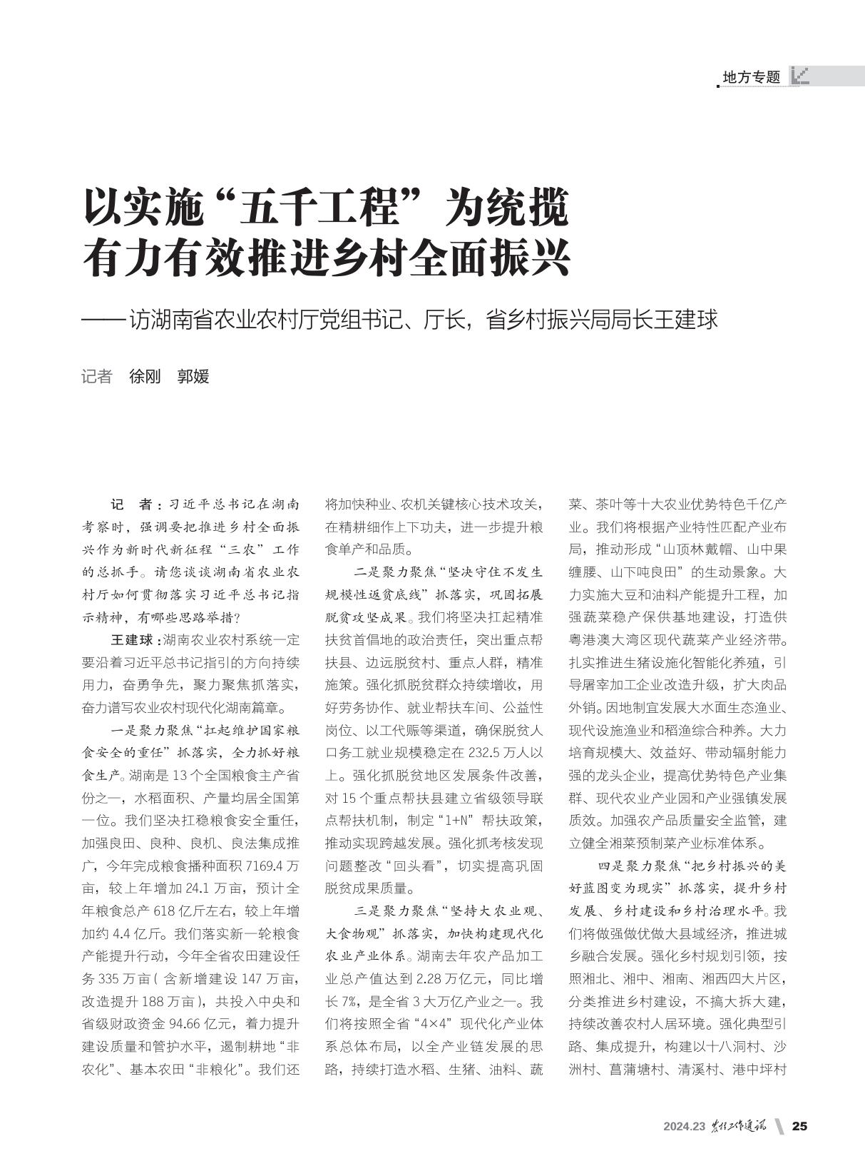 王建球:“五千工程”是指千万亩农田产能提升工程、千村美丽示范建设工程、千亿优势特色产业升级工程、千万农户增收共富工程、千镇万村治理效能提档工程。