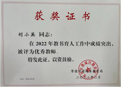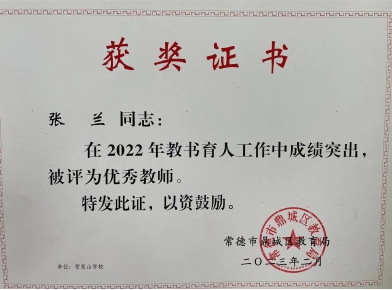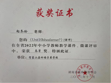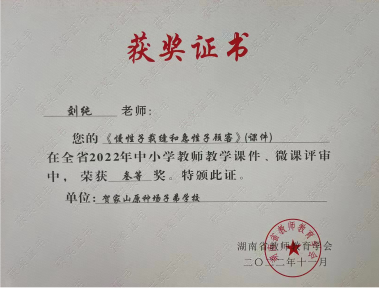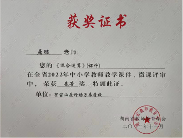 2022年12月,湖南省教师教育学会发文通报,屠璇荣获2022年度省级微课与课件大赛二等奖,刘纯、向冬玲荣获2022年度省级微课与课件大赛三等奖;姚飞云、雷鸣、孟婉君教师撰写的论文荣获省级二等奖,张兰等11位教师撰写的论文荣获省级三等奖。