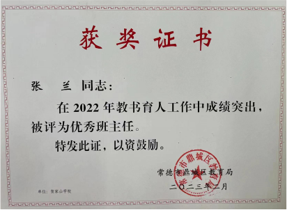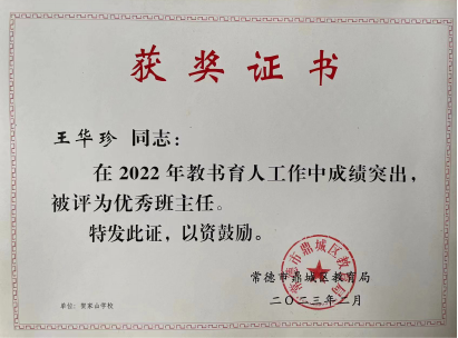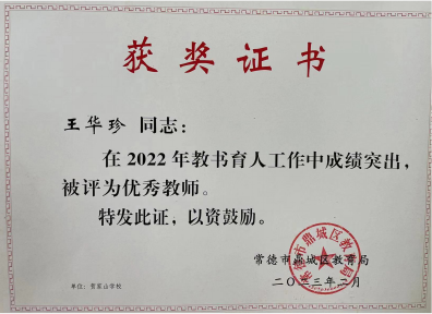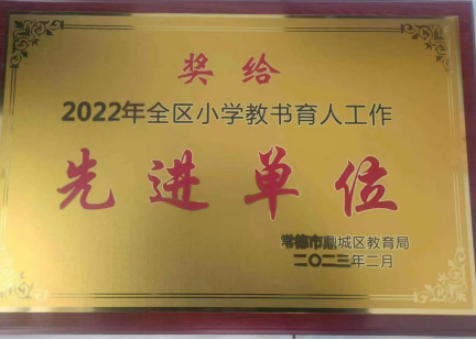 近日传来喜讯,贺家山子弟学校荣获2022年度“鼎城区小学教书育人工作先进单位”、“鼎城区小学毕业会考学科(语文、数学)先进单位”、“鼎城区四年级质量监测考试学科(数学)先进单位”等荣誉称号。刘小英、王华珍、张兰被评为“鼎城区义务教育阶段教书育人优秀教师”,王华珍、张兰被评为“鼎城区义务教育阶段教书育人优秀班主任”。