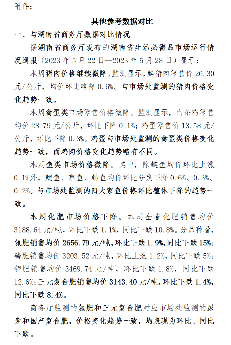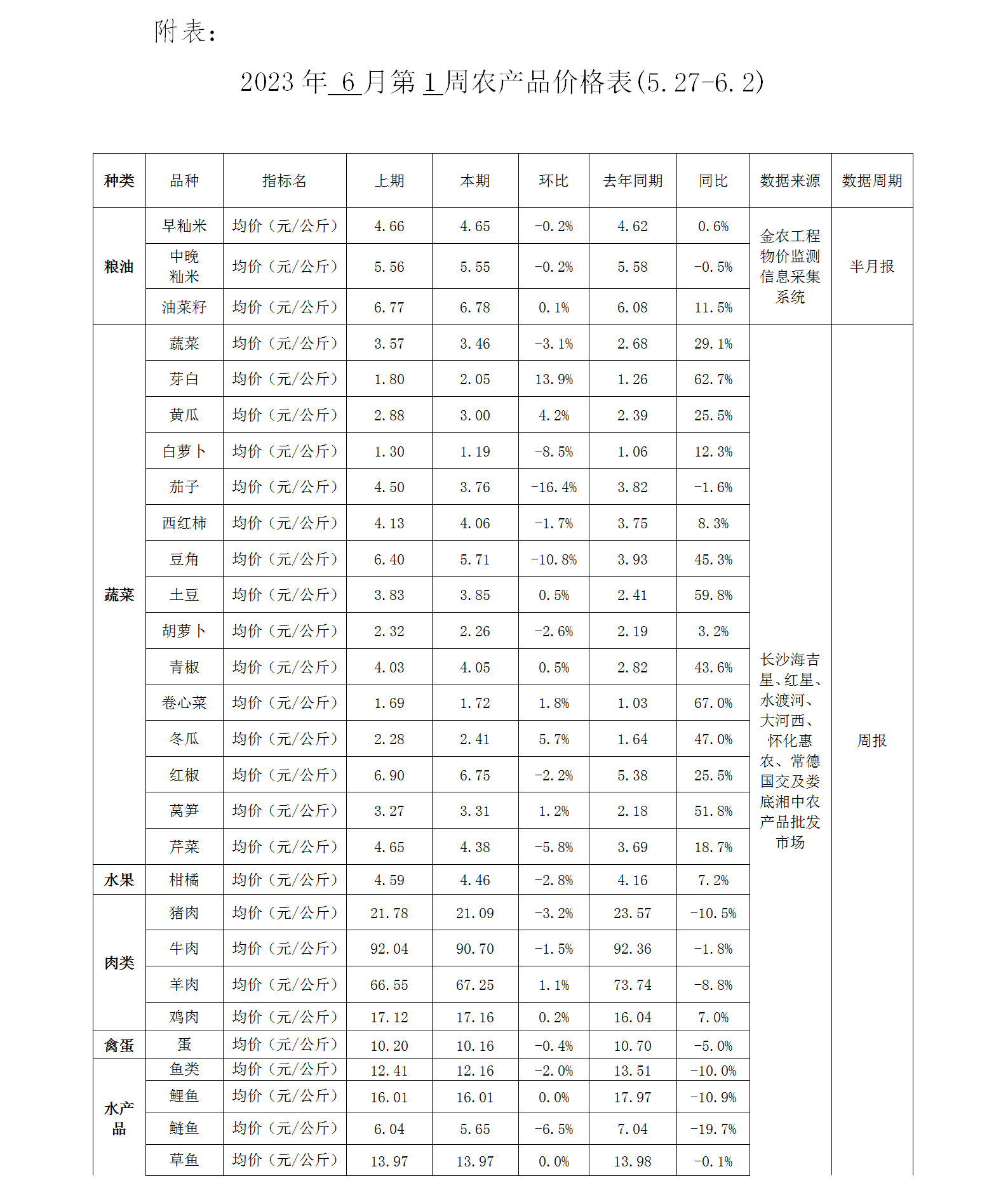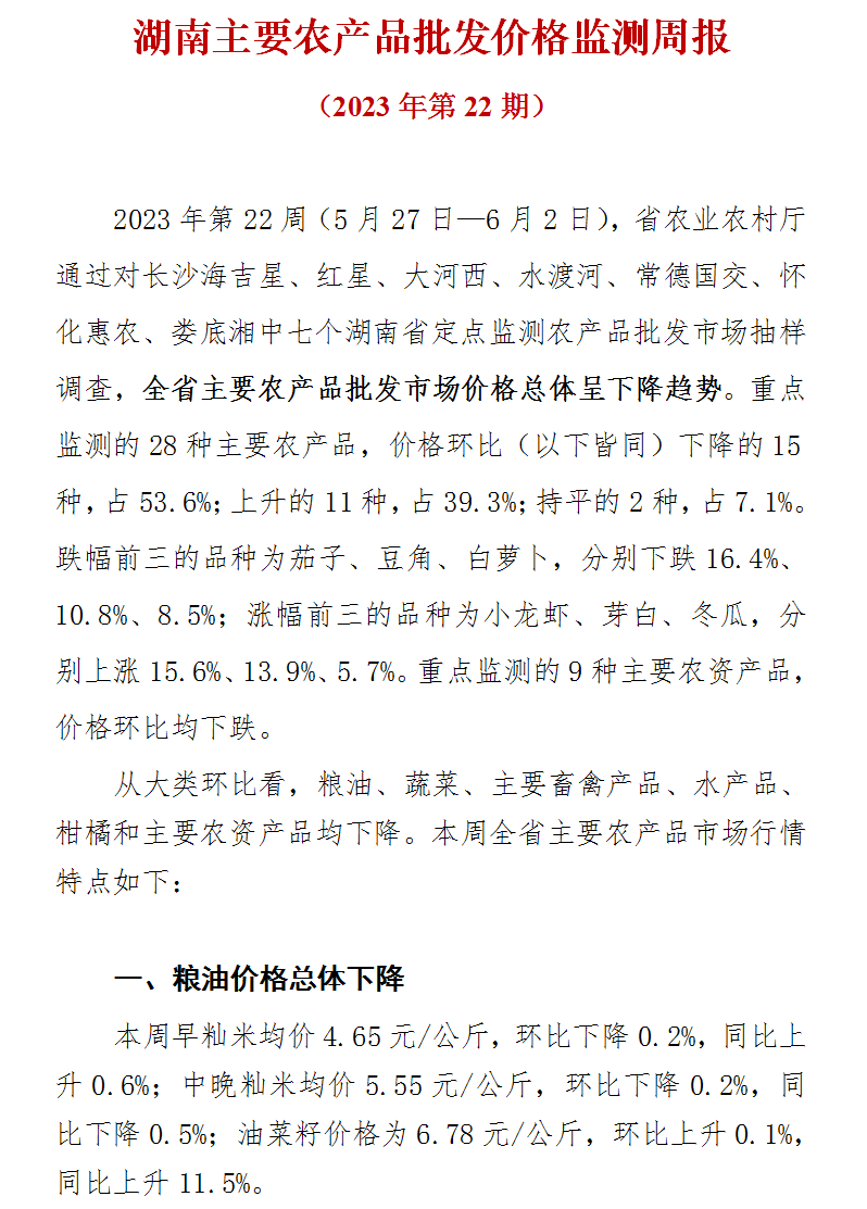 湖南主要农产品批发价格监测周报(2023年第22期)
