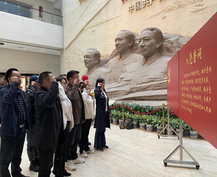 进入展厅,映入眼帘的是名为“潇湘魂”的毛泽东、刘少奇、任弼时三位伟人的雕像,看到伟人雕像近在咫尺,令人倍感振奋。在支部书记姚英的带领下,全体党员面向鲜红的党旗坚定地举起右手庄严宣誓,重温入党誓词,在掷地有声的誓言中,再一次感受到作为一名中共党员的使命和责任。