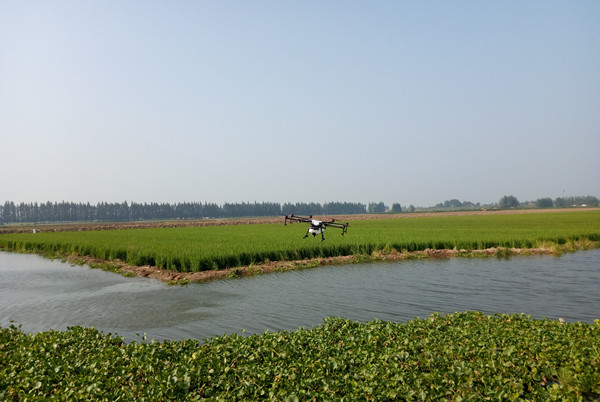 据了解,植保无人机防治原理是利用飞机多旋翼气流将药液直接压迫作用于农作物叶片正反面以及茎基部,穿透力强、漂移少,具有高效、节水、优质、全能、安全、便利等六大突出优点,能有效降低劳动强度,特别适合连片种植区域的施药管理。本次观摩会采用的植保无人机,占地仅2平方米,可搭载10升药液,能随地起飞,在距离稻苗2米左右的超低空喷洒药液,起飞、降落、喷洒作业全部通过飞防手在田埂上遥控操作,比传统人工喷药效率提高近60倍。