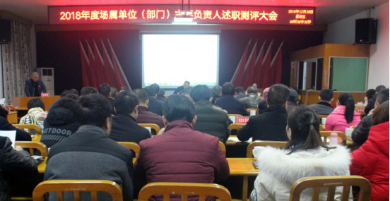12月28日,我场在机关培训楼教室举行2018年度场属单位(部门)主要负责人述职测评大会。党委副书记、副场长邵泽毅主持会议。