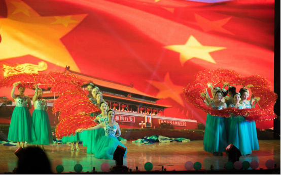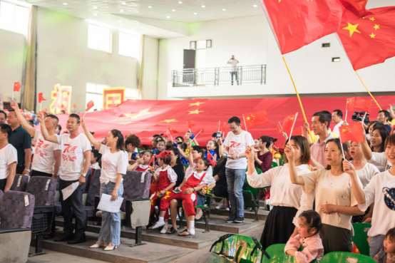 文艺汇演在大合唱《我和我的祖国》中拉开序幕,台上台下互动演出,全场红旗飘飘,大家心情激昂,唱出了对祖国的热爱,一开始就掀起了高潮。