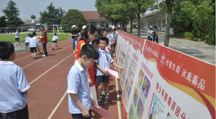 “我们是炎黄子孙,我们是贺家山儿女,不忘国耻,珍爱生命,远离毒品,不吸毒、不贩毒、不制毒、不种毒,积极检举吸贩毒行为,自觉抵制毒品侵蚀。从我做起,从现在做起,毒品一日不绝,禁毒一刻不止!主动投身新时代禁毒人民战争,为推进平安贺家山、法制贺家山建设作出新的更大的贡献!”的誓言在校园中回响,每个参与者都在在国旗下进行了庄严的禁毒宣誓,都在“珍爱生命,远离毒品”横幅上郑重签名,现场阅读了场禁毒办发出的《关于禁毒宣传致全场广大人民群众的一封信》,观看了禁毒宣传展板,听志愿者们讲述毒品的危害。