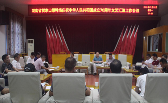会上,场党委委员、场长助理、办公室主任谭旭生宣读了《湖南省贺家山原种场关于庆祝中华人民共和国成立70周年文艺汇演活动方案》;通报了文艺汇演节目构想,与会人员对文艺汇演节目构想进行了讨论并做表态发言。