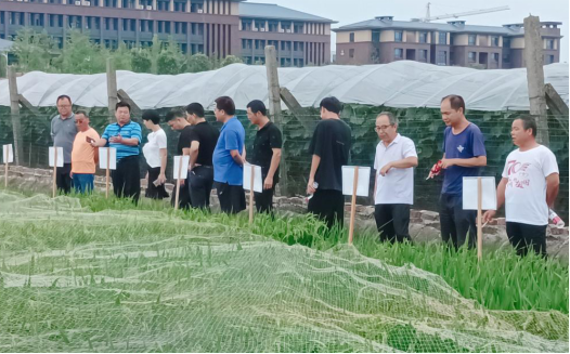 在农林科学院水稻科研基地,水稻研究所所长彭建、副所长贾琳带领大家实地查看了水稻生长情况,并详细介绍了水稻新品种选育、水稻区域试验等各类科研项目的执行情况。