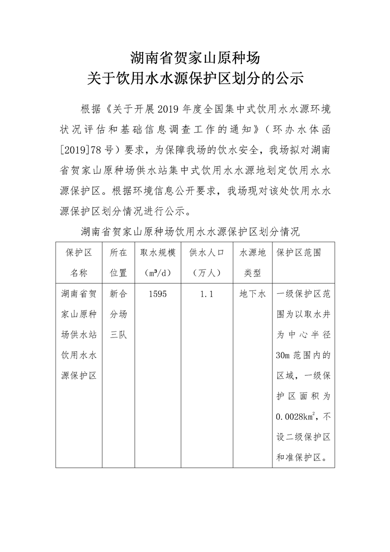 湖南省贺家山原种场 关于饮用水水源保护区划分的公示
