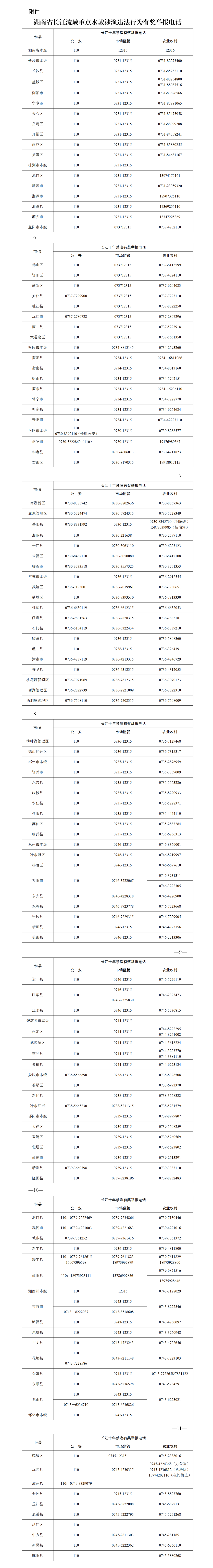 附件:湖南省长江流域重点水域涉渔违法行为有奖举报电话