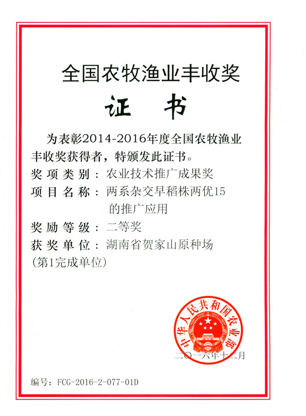 2016年12月,由姜守全、李智谋、谭旭生等主持完成的《两系杂交早稻株两优15的推广应用》获2014—2016年度全国农牧渔业丰收奖二等奖。