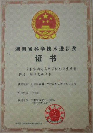 由湖南桃花源农业科技股份有限公司、岳阳市农业科学研究所、湖南省贺家山原种场和常德市农林科学研究院合作完成的“适轻简栽培杂交晚稻新品种的选育与推广”项目获得2018年度湖南省科学技术进步奖三等奖,我场首席育种专家李智谋为第三完成人。