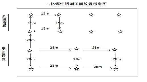 2、放置密度。平均1亩放置1个。外围区稍密,要求每隔15米放置1个,中心区稍疏,要求每隔28米放置1个。详见示意图: