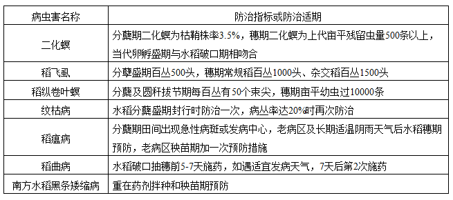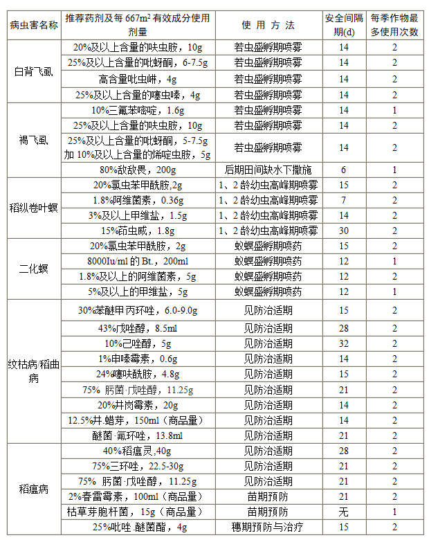 加强病虫监测,精准预报,在水稻主要病虫害的关键防治适期或达到防治指标时(表1),推广应用高效、低毒、低残留绿色新农药,集中开展专业化统防统治,提倡不同作用机理药剂合理轮用与混配,避免长期、单一使用同一药剂。严格按照农药使用操作规程用药(表2),遵守农药安全间隔期,确保稻米质量安全。提倡使用高含量单剂,避免使用低含量复配剂。禁止使用含拟除虫菊酯类成分的农药,谨慎使用有机磷类农药,尽量应用氯虫苯甲酰胺、烯啶﹒吡蚜酮等环境友好型农药。
