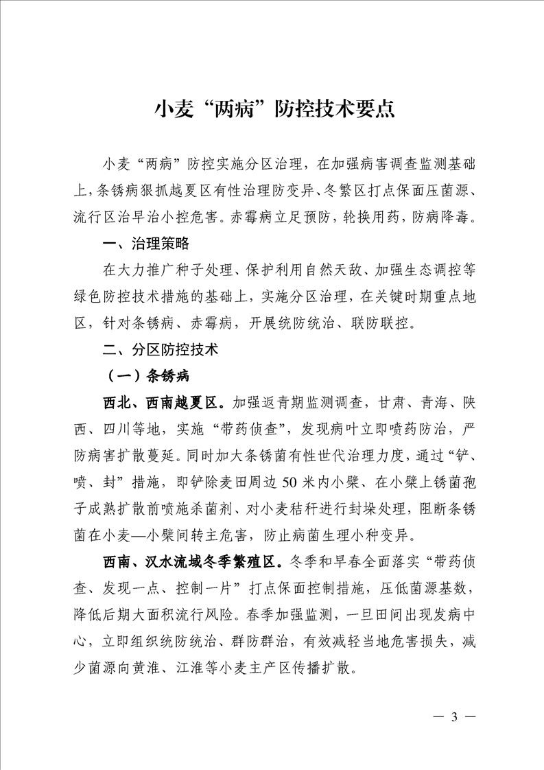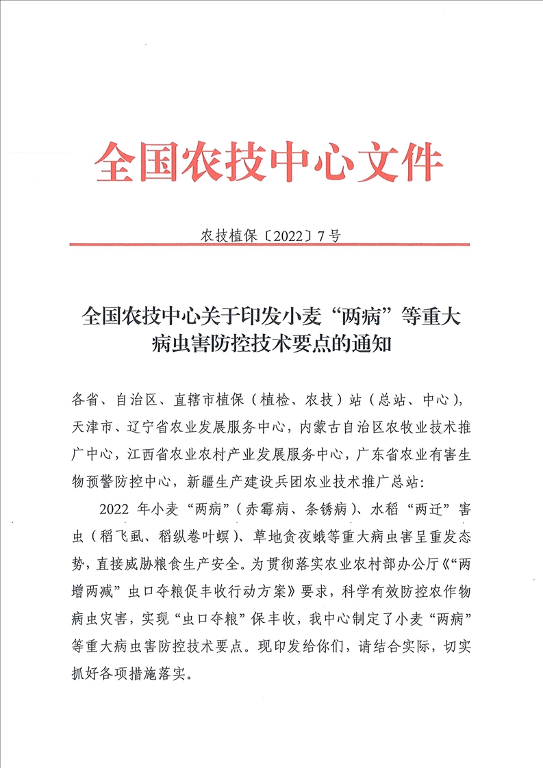 全国农技中心关于印发小麦“两病”等重大病虫害防控技术要点的通知
