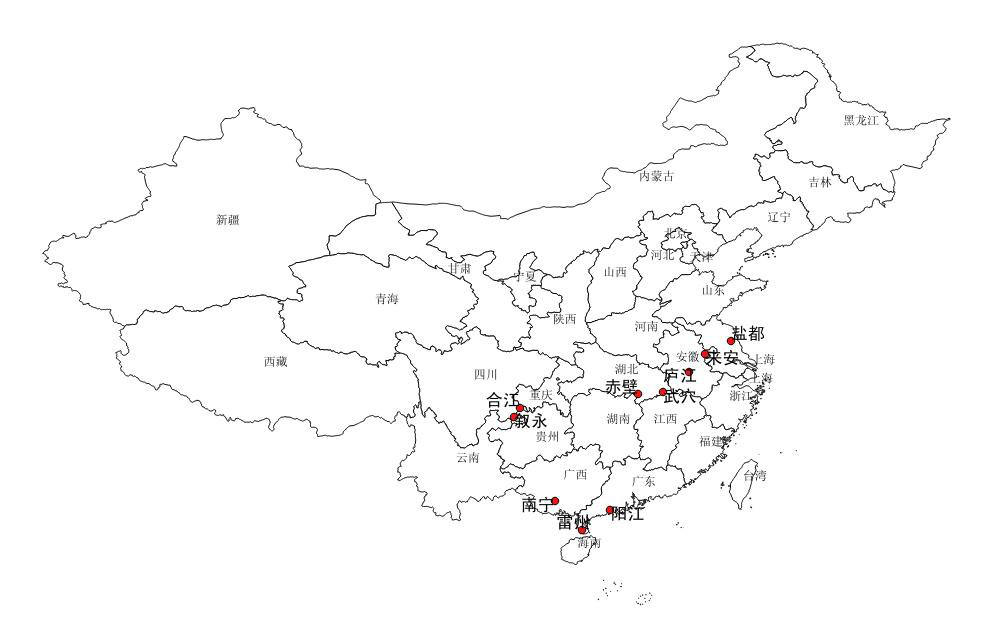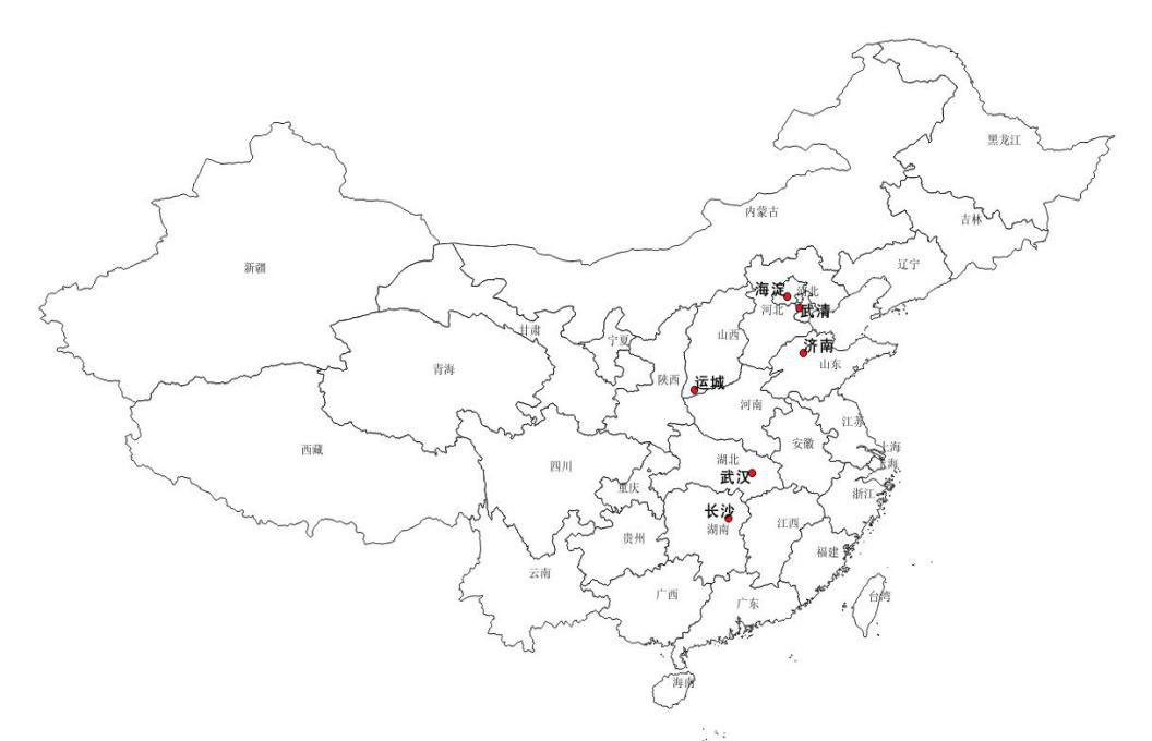 天津市武清区、河北省张北县、内蒙古自治区乌兰察布市、江苏省南京市、浙江省杭州市。