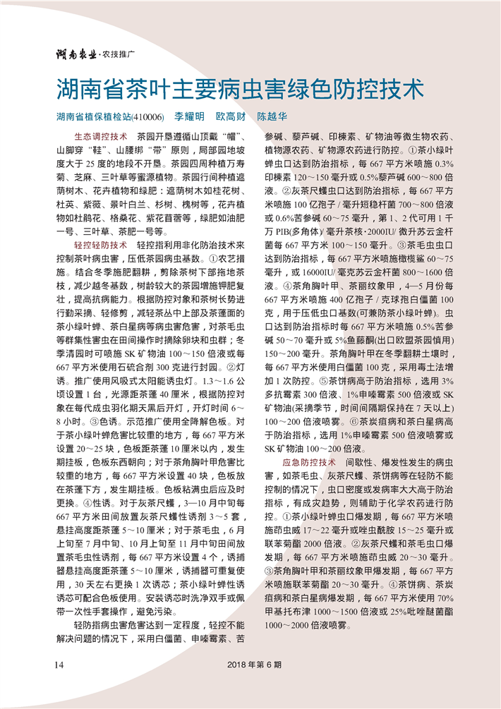 湖南省茶叶主要病虫害绿色防控技术